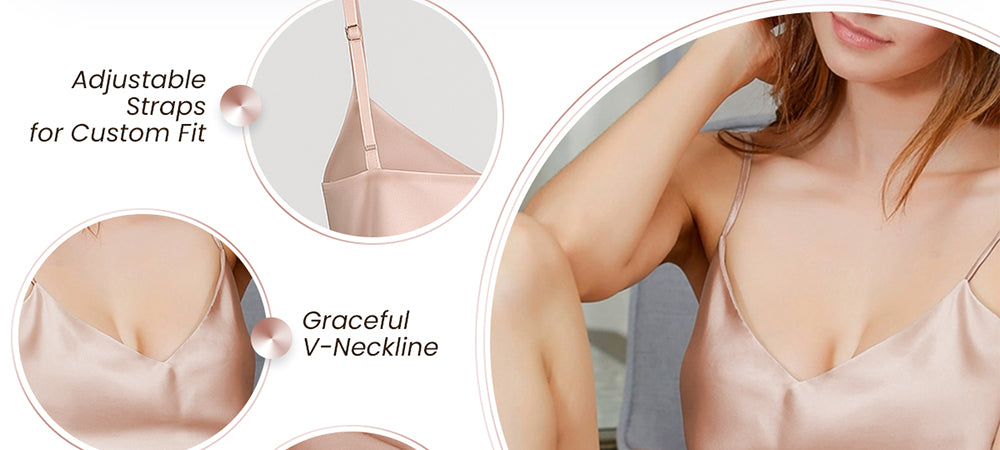 - 19 Momme 100% 6A+Grade Mulberry Silk — Luxuriate in 19 momme silk (22% thicker than standard) with a sleek satin finish. The same high-end silk used in premium designer sleepwear, this ultra-soft, smooth fabric glides over your curves like a second skin.
