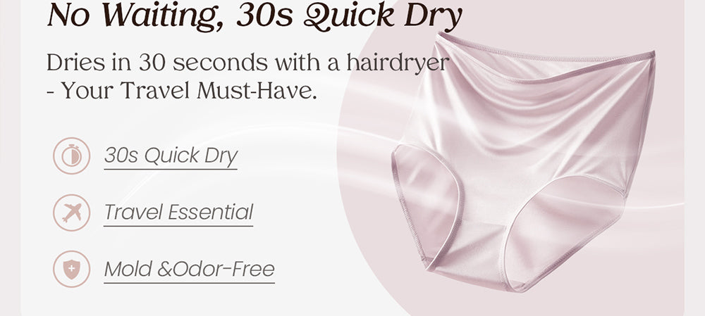 - Quick-Dry & Travel Must-Have – No need for a dryer—just use a hairdryer to dry these silk panties in 30 seconds, offering ultimate convenience for travel and everyday use.