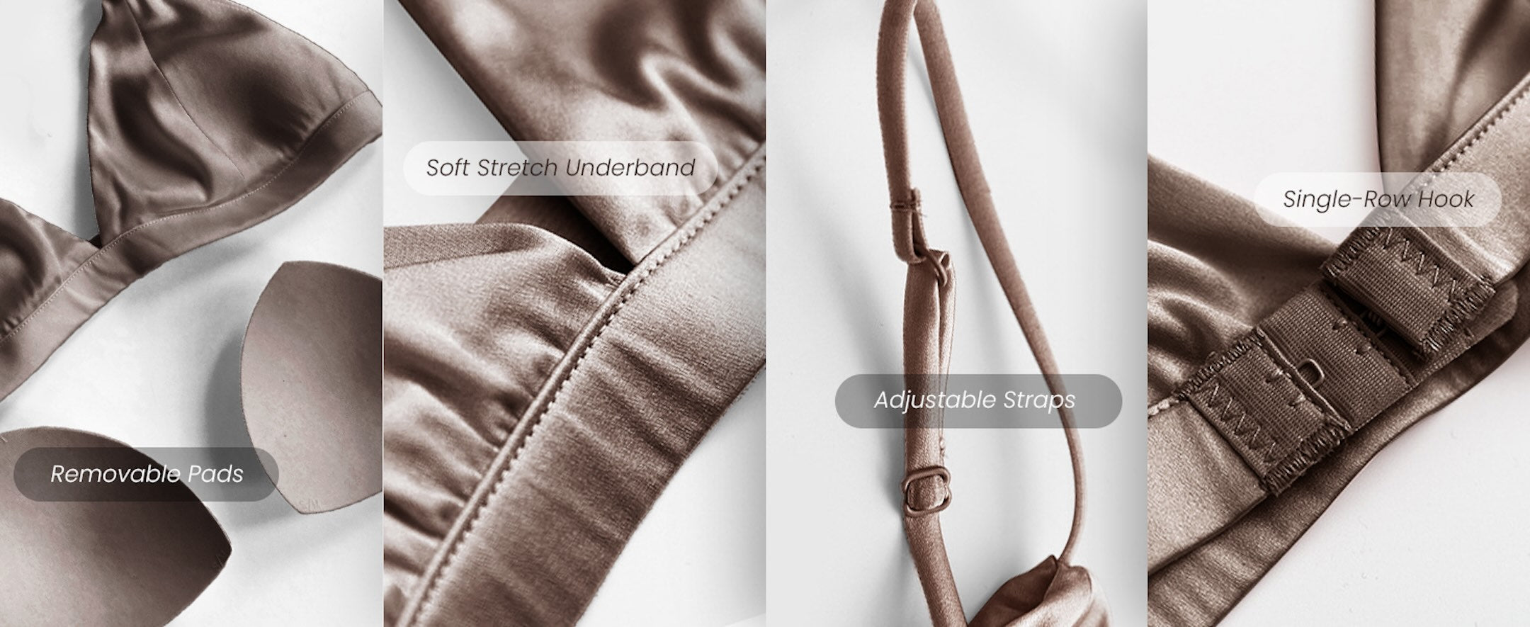 • Luxurious Mulberry Silk Satin – Handcrafted from 95% Mulberry Silk and 5% Spandex, this sexy bra blends luxury with comfort. Indulge in pure elegance of our Mulberry Silk Bra for a soft, smooth feel that caresses your skin all day long.