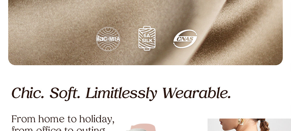 - 19 Momme 100% 6A+Grade Mulberry Silk — Luxuriate in 19 momme silk (22% thicker than standard) with a sleek satin finish. The same high-end silk used in premium designer sleepwear, this ultra-soft, smooth fabric glides over your curves like a second skin.