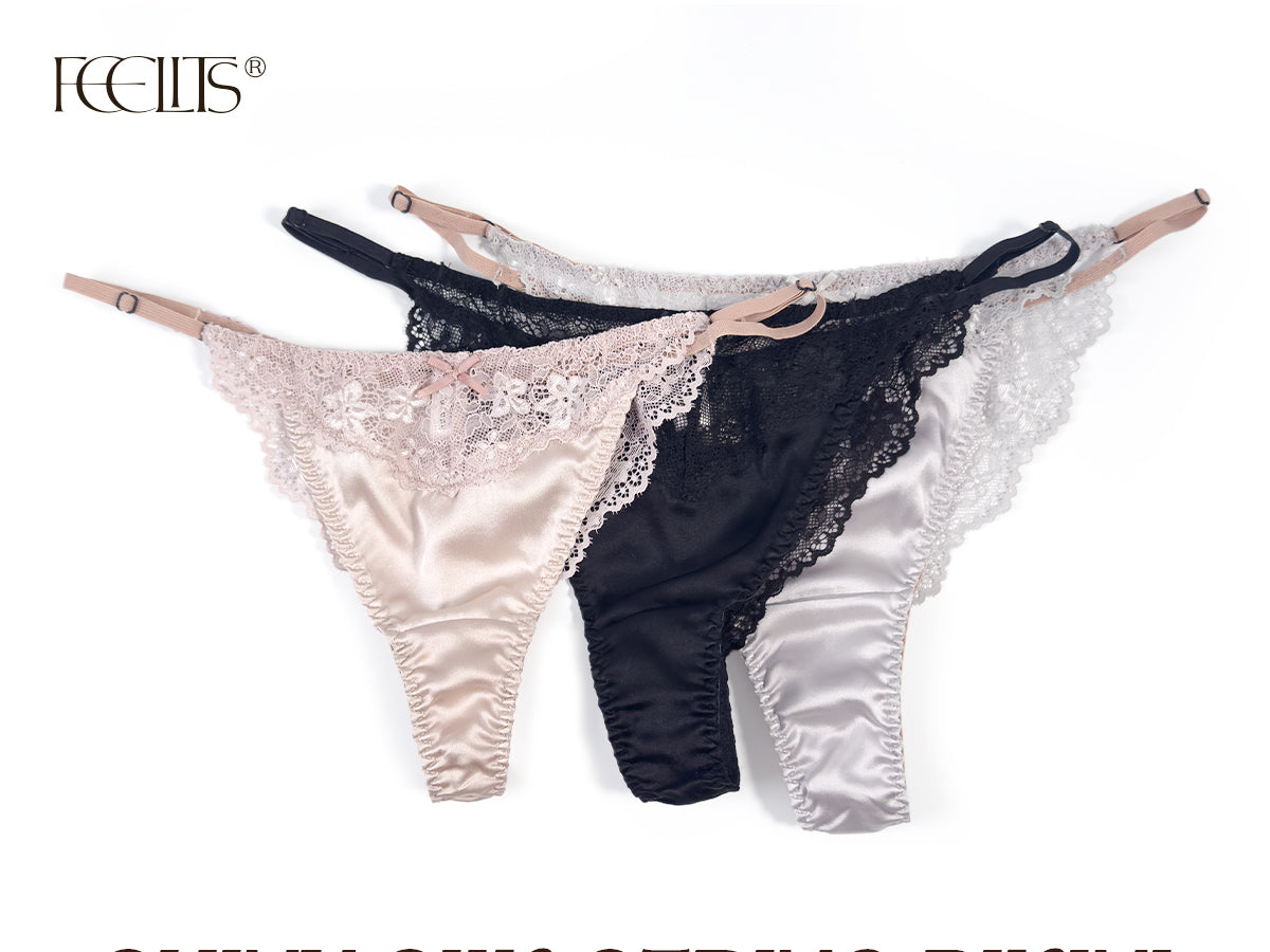 100% Mulberry Silk Thongs for Women, Sexy Shiny Silk Satin G-String Panties with Adjustable Ties, Cheeky T-back