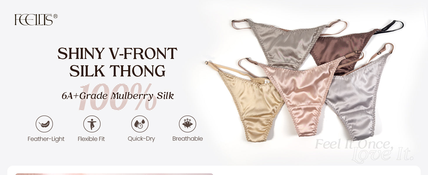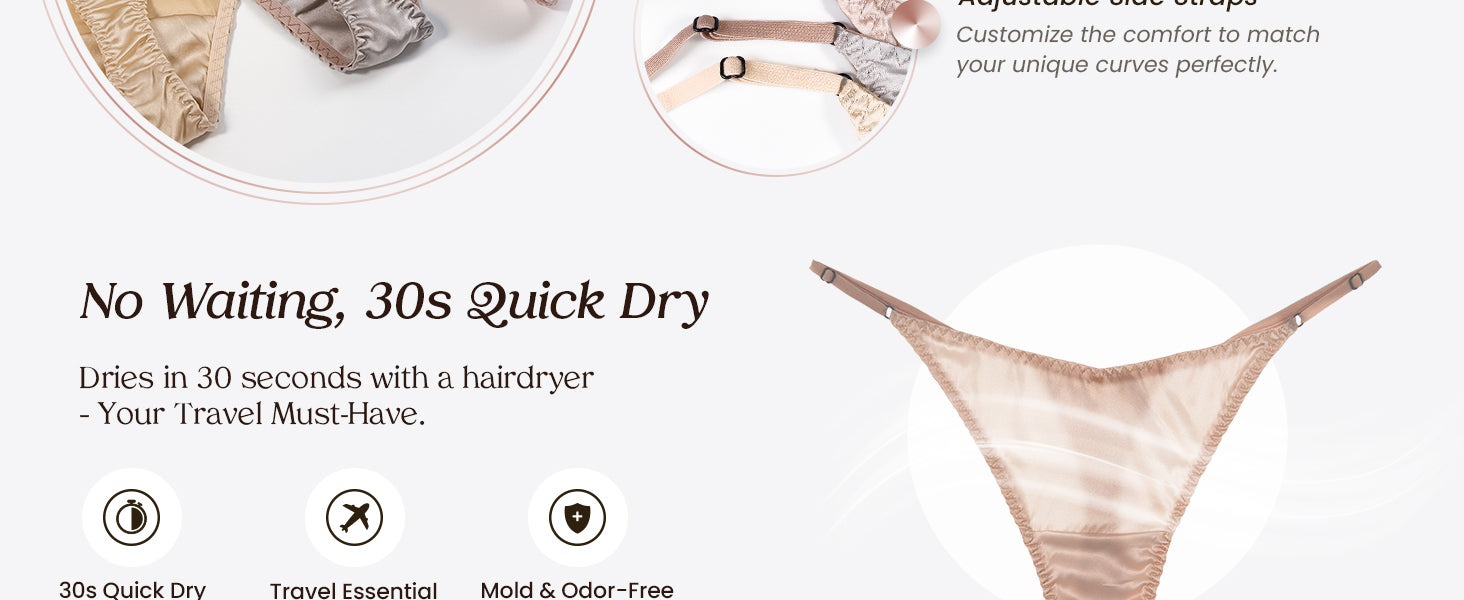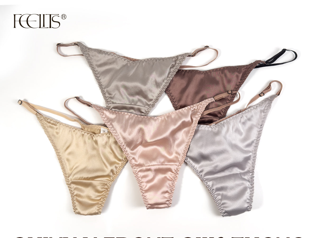 100% Mulberry Silk Thongs for Women, V-Front & Adjustable Ties, Sexy Silk Satin G-String Panties, Cheeky T-back