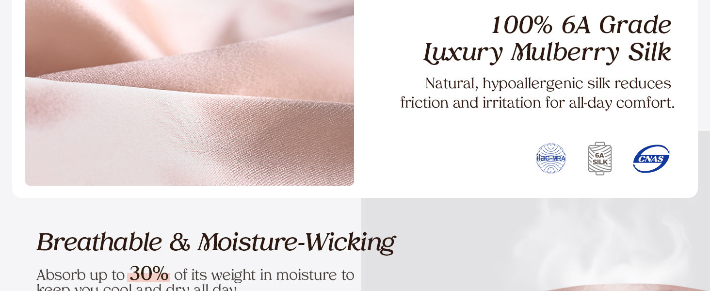 - 6A Grade Silk — Experience the luxury of 6A grade long-strand mulberry silk with a sleek satin finish, the same high-end quality used in premium products. This ultra-soft, smooth fabric feels like a second skin.