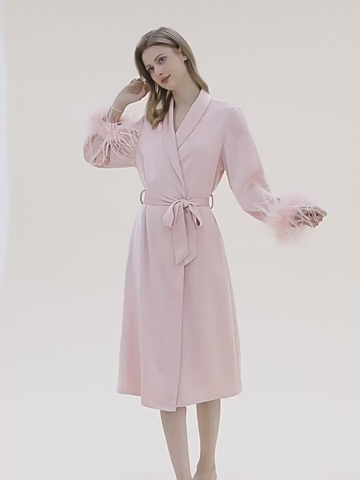 - Chic French-Inspired Design: Featuring a flattering waist tie design, this robe enhances your silhouette with a refined V-neckline. A detachable feather accent on the sleeves adds an extra touch of glamour, perfect for a bride’s morning look.